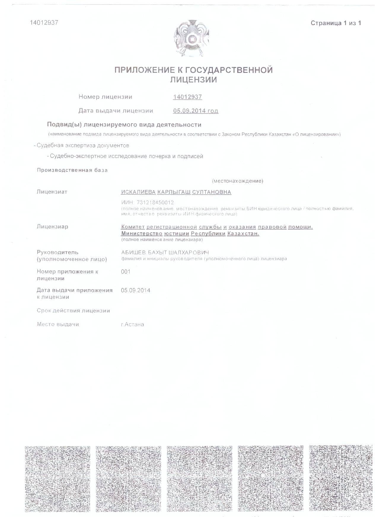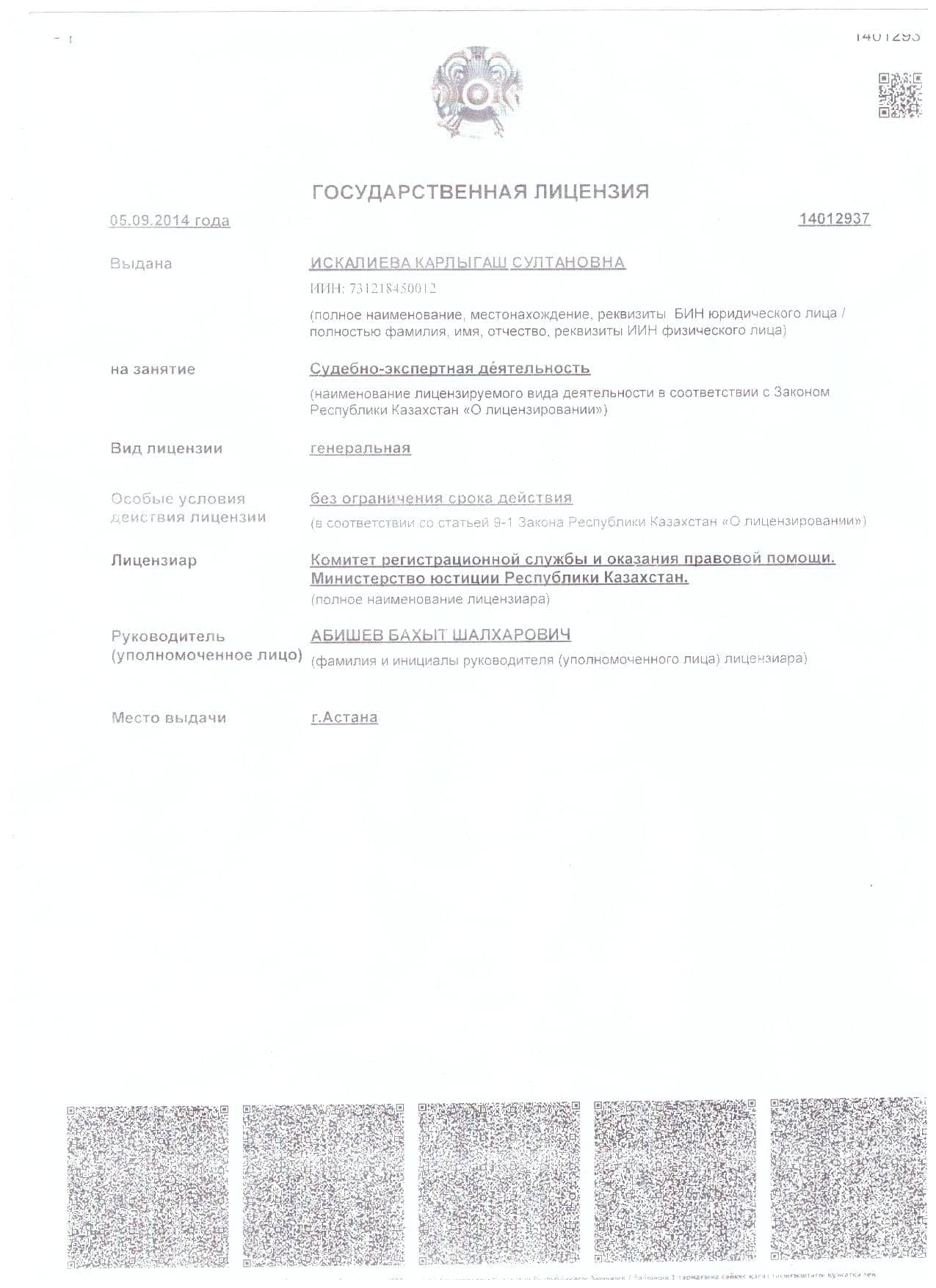 лицензии Министерства юстиции Республики Казахстан от 05.09.2014